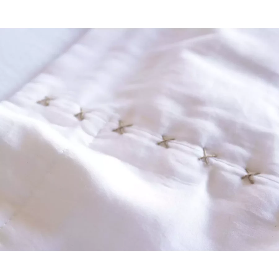 De vederlichte Laila bedsprei is gemaakt van een delicate zachte katoenen voile en met flanel gevuld. De sprei heeft 2 verticale lijnen met linnen geborduurde kruisjes. de sprei is 270 cm breed en 250cm lang.